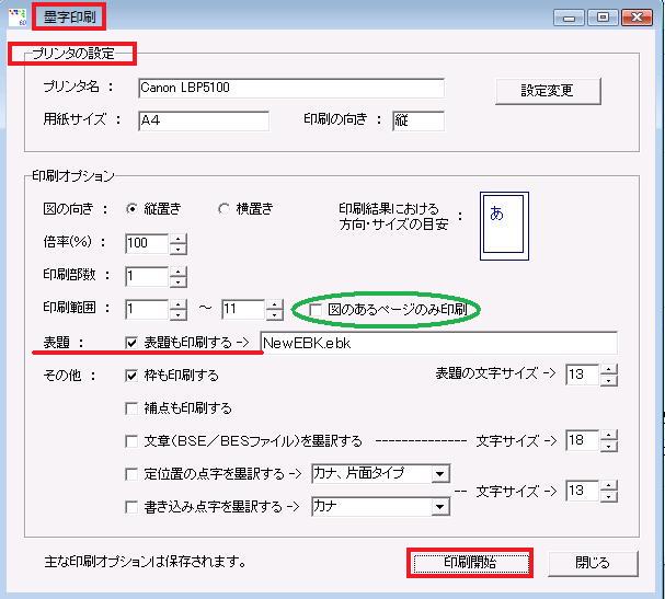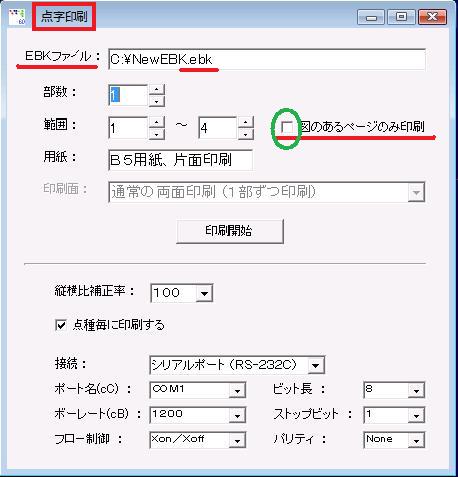 EBKファイル選択時の、 点字印刷のダイアログボックス。 「図のあるページのみ印刷」にチェックを入れると、 指定範囲の 「図のあるページのみ」を その図が含まれる「点字文書と一緒に」印刷する。 チェックを入れなければ、 指定した範囲の「図だけ」を全部印刷する。 |