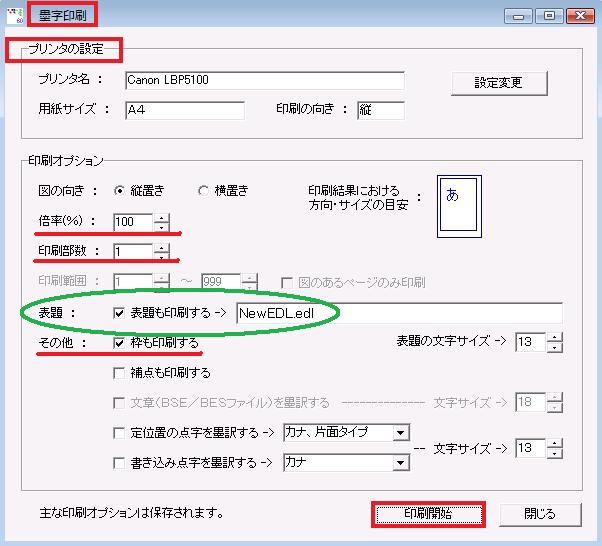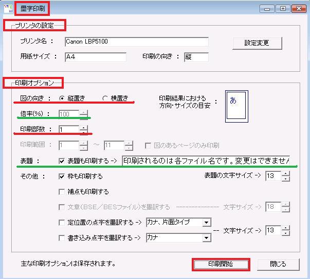 現れますので、ここで必要な設定をしてをクリックすると墨字印刷が実行されます。