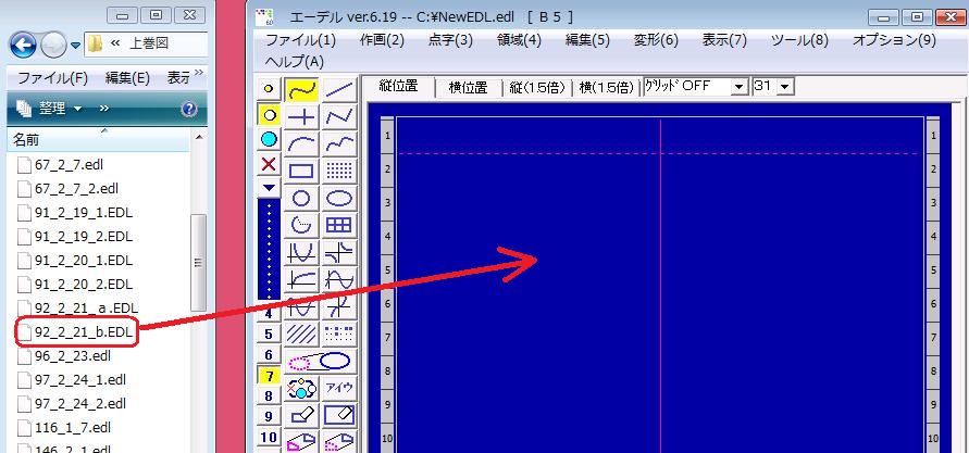 エーデルのでファイルを指定して開くのが一般的な方法ですが、エーデルを立ち上げ、保存してあるフォルダのファイル一覧の中から開きたいファイルを エーデルの画面にドラッグ するという方法もあります。