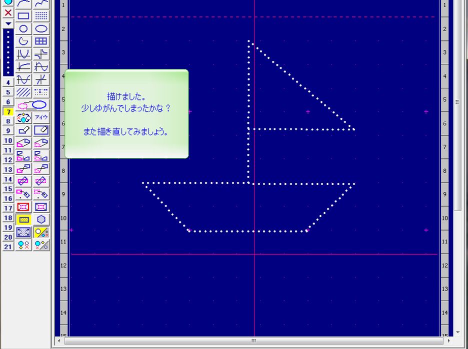 | 初起動そのままの設定で描いてみます。 まっすぐに描くべき線も曲がってしまったり、左右対称に描くのもなかなか難しいものです。 そこで、グリッドを表示させてみました。 |