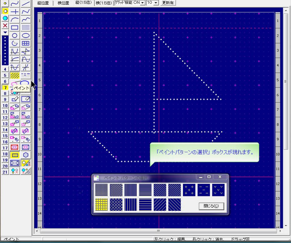 | 輪郭を描いた舟にペイントしてみます。 帆の部分と船体とを別のパターンでペイントしてみました。 ボタンを押さえながらマウスを動かすのが、慣れないとうまくいかないものです。 |