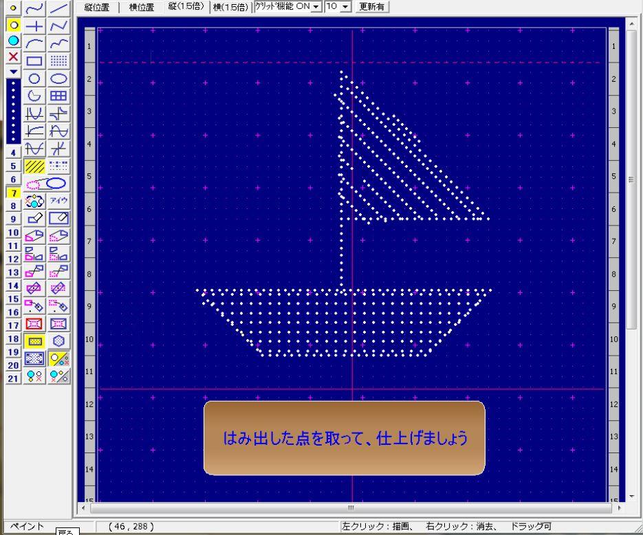 | 仕上げに、はみ出して描いてしまった余計な点を消去します。 ここでは、自由曲線モードの右クリックを使うやり方と、領域を指定して消去する方法で消去しています。 |